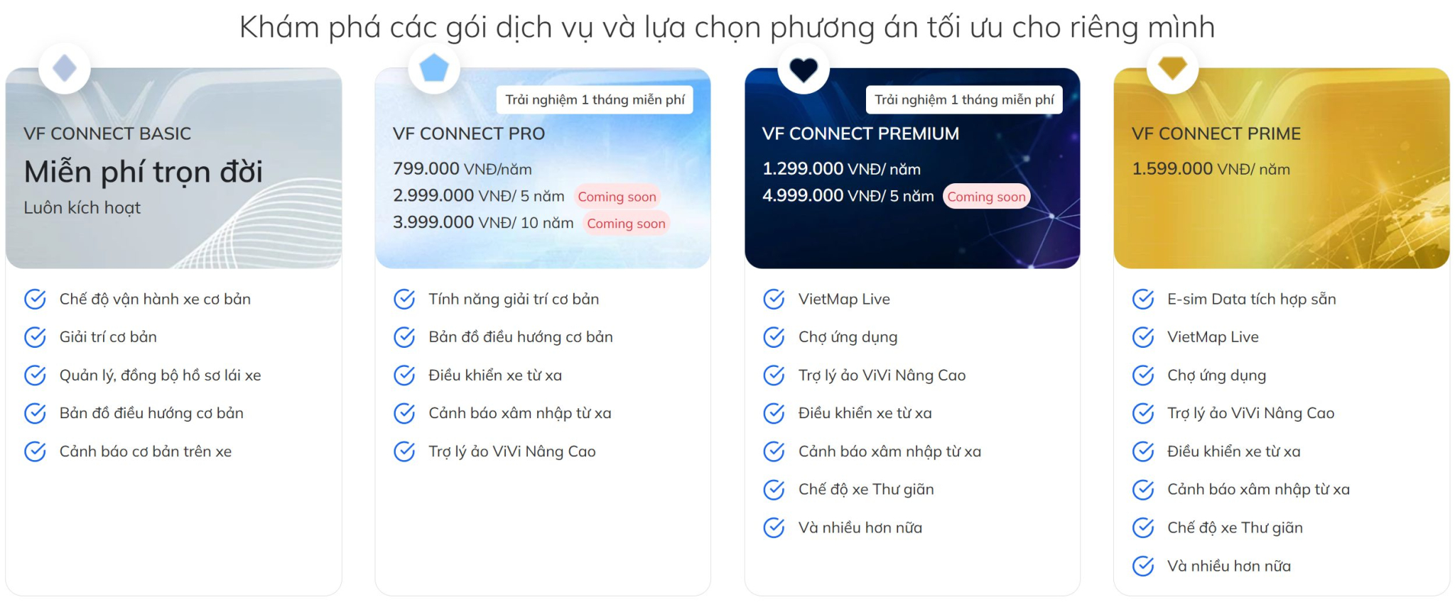 Tính năng: Bao gồm toàn bộ gói PRO + Vietmap Live Pro (Cảnh báo tốc độ, phạt nguội), Kho ứng dụng VF Connect Store, Cá nhân hóa giao diện Widget và Chế độ thư giãn.